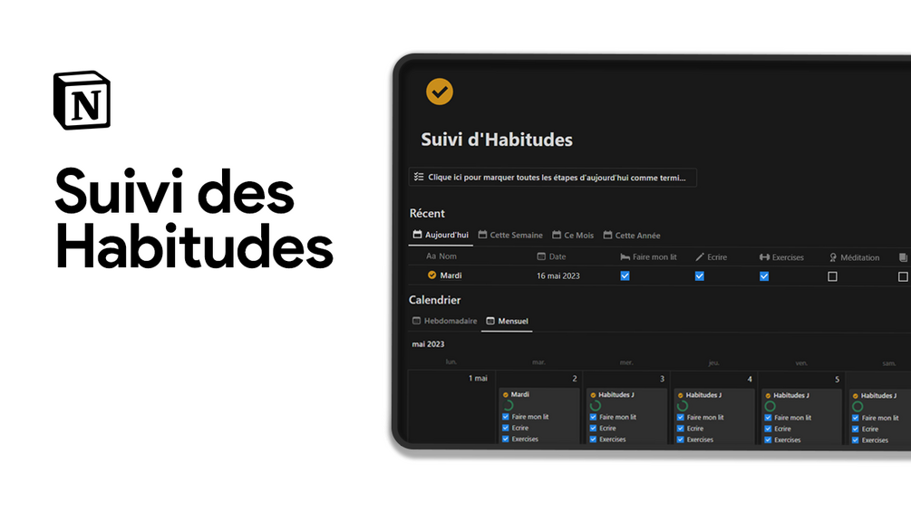 Avec ce modèle Notion, vous avoir une vue quotidienne, hebdomadaire, mensuelle et calendaire de vos habitudes.